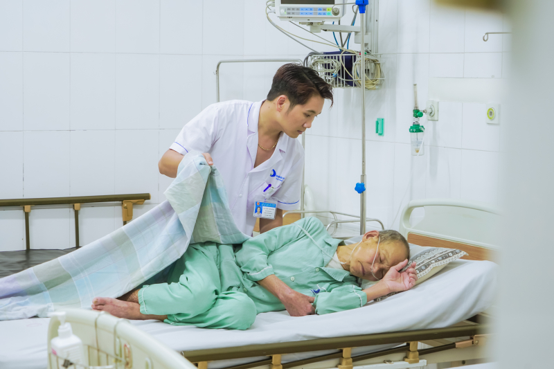 Người bệnh cao tuổi được Điều dưỡng khoa Tim mạch - Bệnh viện Bãi Cháy chăm sóc giấc ngủ.