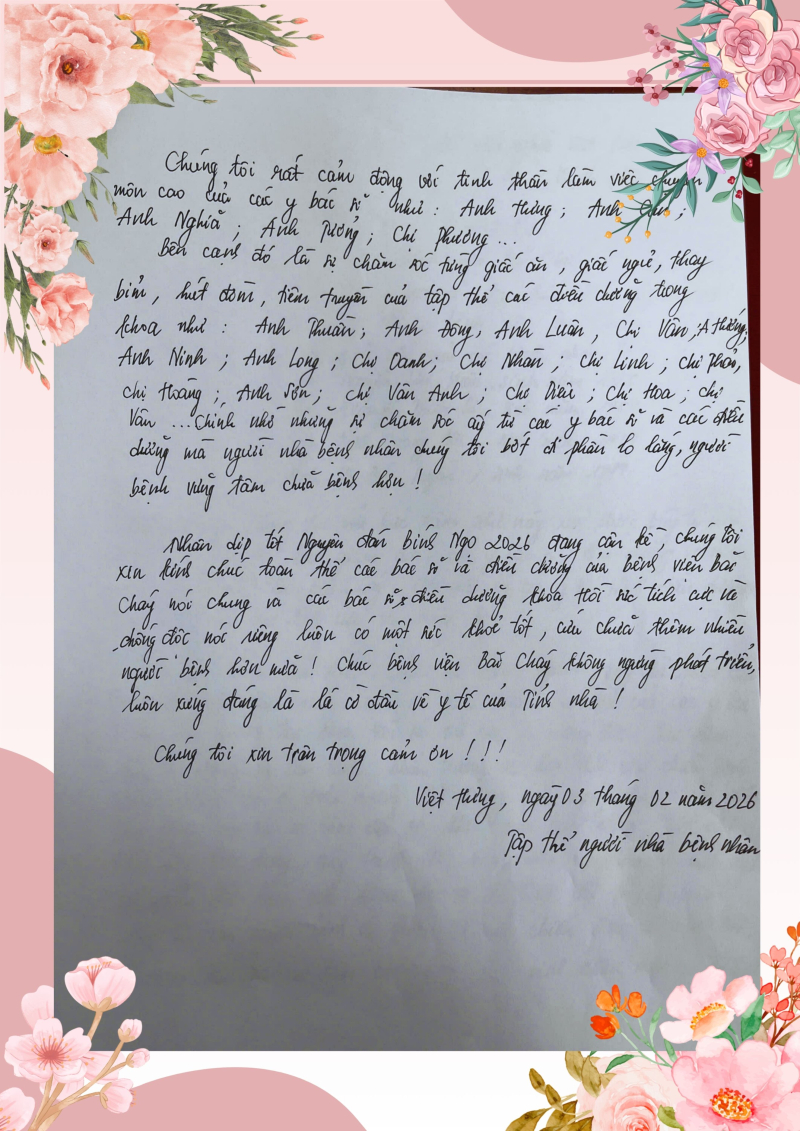 Những ngày đầu xuân năm mới 2026, Ban Giám đốc và tập thể y, bác sĩ, điều dưỡng Khoa Hồi sức tích cực và Chống độc – Bệnh viện Bãi Cháy đã nhận được bức tâm thư đầy xúc động của đại diện gia đình các bệnh nhân từng điều trị tại khoa.