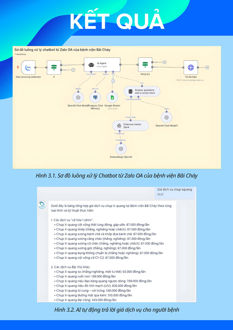 Hệ thống AI Agent hoạt động như một trợ lý ảo y tế thông minh, ứng dụng trí tuệ nhân tạo và xử lý ngôn ngữ tự nhiên, cho phép tự động tư vấn, hướng dẫn thủ tục khám chữa bệnh, đặt lịch khám, tra cứu kết quả xét nghiệm và cung cấp thông tin y tế cho người bệnh 24/7 ngay trên Zalo. Trợ lý ảo có khả năng hiểu và phản hồi bằng tiếng Việt, tiếng Anh, đồng thời ghi nhớ lịch sử tương tác để cá nhân hóa nội dung tư vấn.