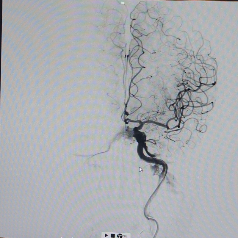 Bệnh nhân nhập viện trong tình trạng xuất hiện các triệu chứng của nhồi máu não cấp tính như yếu liệt nửa người trái, vận động hạn chế. Qua thăm khám lâm sàng và chụp cộng hưởng từ (MRI) sọ não, các bác sĩ ghi nhận hình ảnh tổn thương não và nghi ngờ bất thường mạch máu não, trong đó có dấu hiệu gợi ý rò động mạch cảnh – xoang hang.