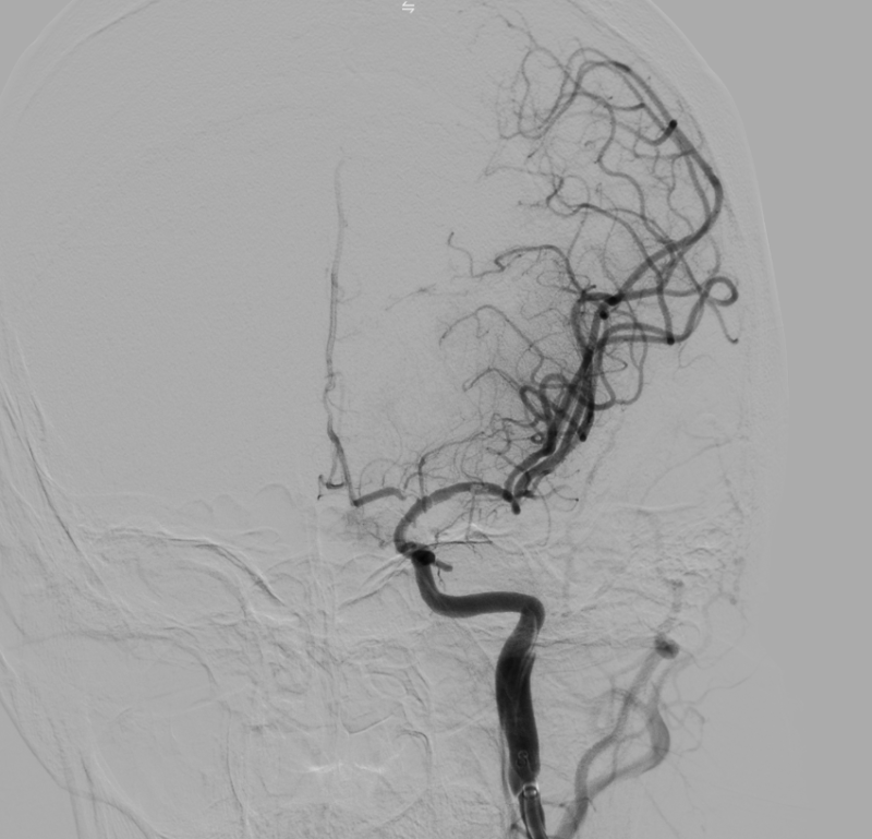 Ngay lập tức, bệnh nhân được chụp MRI sọ não, kết quả cho thấy tắc động mạch cảnh trong – não trước – não giữa bên trái, đặc biệt tắc động mạch não trước đoạn A2 phải, gây nhồi máu não ổ bán cầu trái.