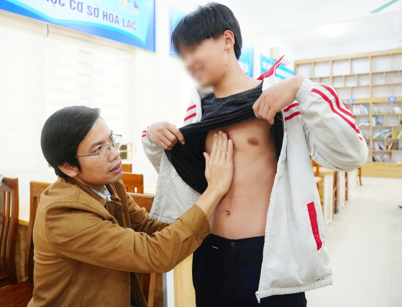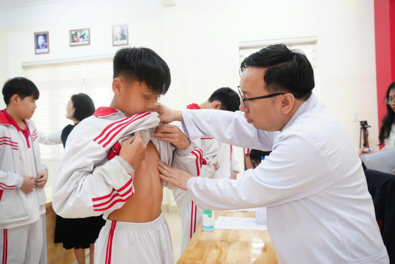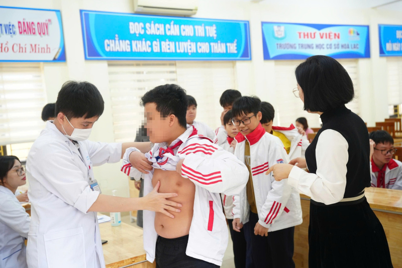 Với sự chỉ đạo chuyên môn của BSCKII Hoàng Văn Quyết - Phó Giám đốc Bệnh viện Bãi Cháy, Đoàn công tác đã trực tiếp thăm khám cho hơn 700 học sinh Trường THCS Hòa Lạc. Hoạt động khám được triển khai bài bản, khoa học, kết hợp giữa thăm khám lâm sàng, tư vấn chuyên sâu, hướng trọng tâm đánh giá hình thái lồng ngực, chức năng hô hấp – tim mạch và sàng lọc dị tật lõm ngực bẩm sinh và các dạng biến dạng lồng ngực khác.