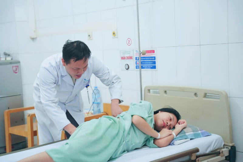 Bác sĩ CKII Lê Triệu Linh khám lại cho chị Thảo sau phẫu thuật.