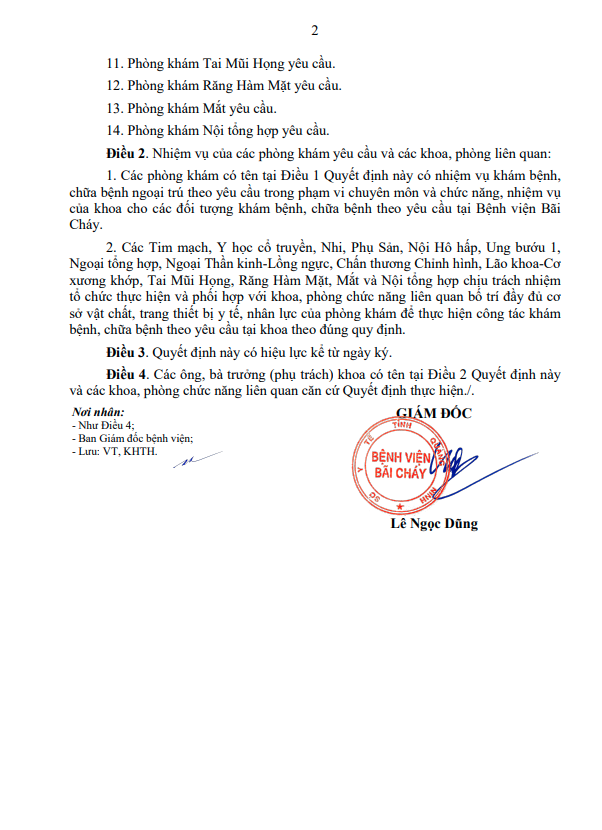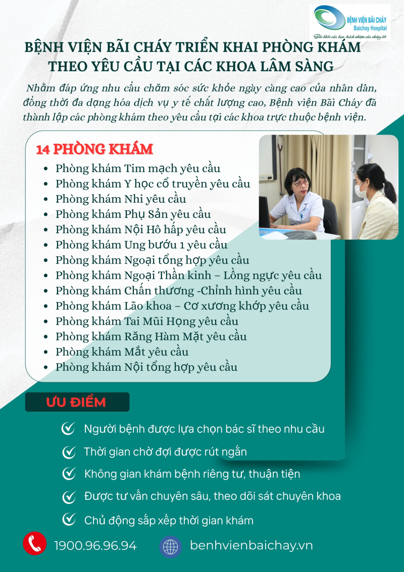 Nhằm đáp ứng nhu cầu chăm sóc sức khỏe ngày càng cao của nhân dân, đồng thời đa dạng hóa dịch vụ y tế chất lượng cao, Bệnh viện Bãi Cháy đã thành lập các phòng khám theo yêu cầu tại các khoa trực thuộc bệnh viện.
