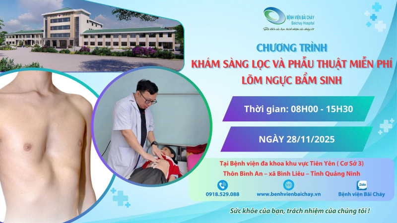 Triển khai nhiệm vụ khoa học và công nghệ cấp tỉnh về “Nghiên cứu ứng dụng phẫu thuật Nuss cải tiến điều trị lõm ngực bẩm sinh” do Sở Khoa học và Công nghệ tỉnh Quảng Ninh phê duyệt. Bệnh viện Bãi Cháy sẽ phối hợp cùng Bệnh viện Đa khoa khu vực Tiên Yên (cơ sở 3) tổ chức chương trình khám sàng lọc miễn phí cho trẻ em vào ngày 28/11/2025.