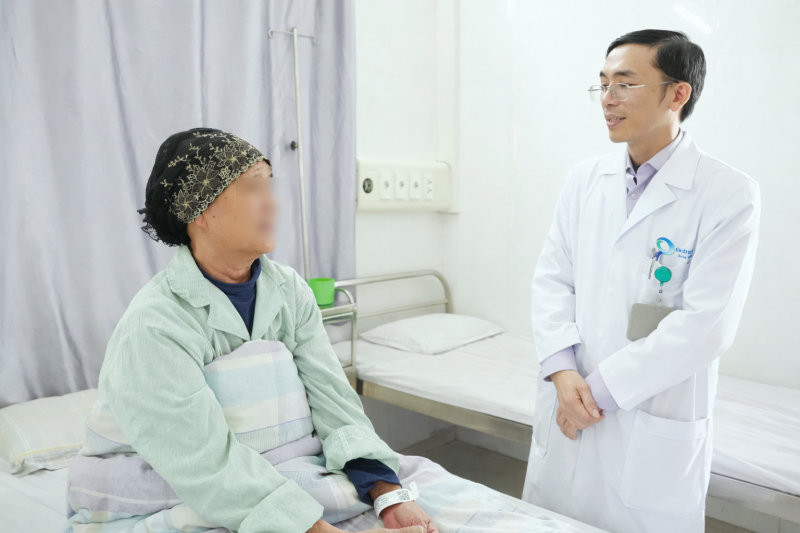 Một trường hợp điển hình là bệnh nhân Vũ T.T (66 tuổi, phường Vàng Danh, tỉnh Quảng Ninh) được chẩn đoán ung thư vú phải giai đoạn cT2N2M1 với di căn gan đa ổ vào tháng 10/2025 tại Bệnh viện Bãi Cháy. Sau khi đánh giá toàn diện và hội chẩn chuyên môn, bệnh nhân được chỉ định điều trị hóa trị kết hợp thuốc nhắm trúng đích HER2 (docetaxel – carboplatin – trastuzumab). Sau 3 chu kỳ điều trị, tình trạng toàn thân ổn định, kích thước khối u vú giảm, mật độ khối u mềm hơn, không sờ thấy hạch ngoại vi bất thường và chưa ghi nhận biến chứng nặng liên quan điều trị.