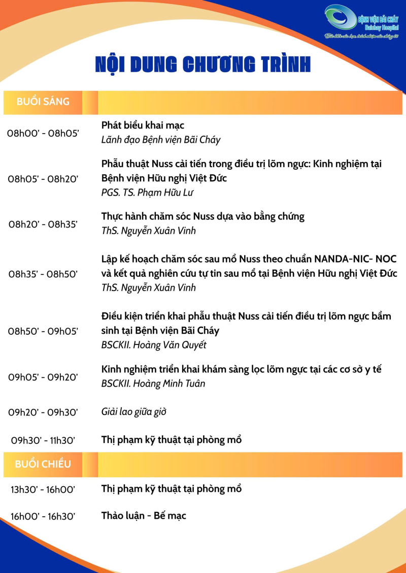 - Phẫu thuật Nuss cải tiến có nội soi hỗ trợ trong điều trị lõm ngực: Kinh nghiệm tại Bệnh viện Hữu nghị Việt Đức  do PGS.TS. Phạm Hữu Lư, Phó Trưởng khoa Ngoại Tim mạch và Lồng ngực, Trung tâm Tim mạch và Lồng ngực, Bệnh viện Hữu nghị Việt Đức, trình bày.