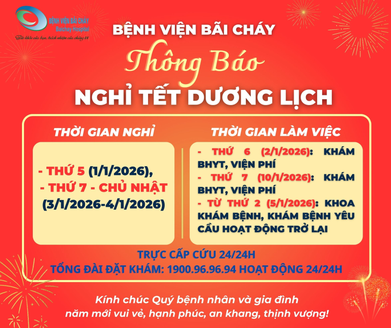 Bệnh viện Bãi Cháy xin thông báo thời gian nghỉ Tết dương lịch năm 2026 để quý bệnh nhân, người nhà được biết và chủ động trong thời gian đến khám, chữa bệnh.