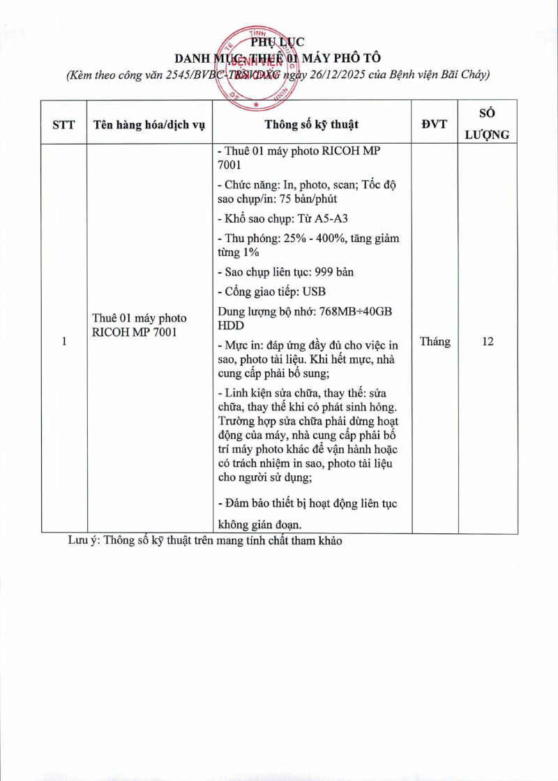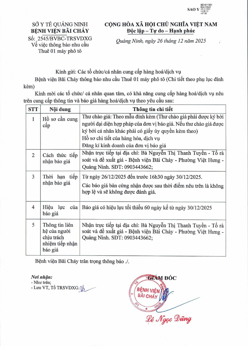 Thông báo số 2545 về nhu cầu thuê 01 máy phô tô