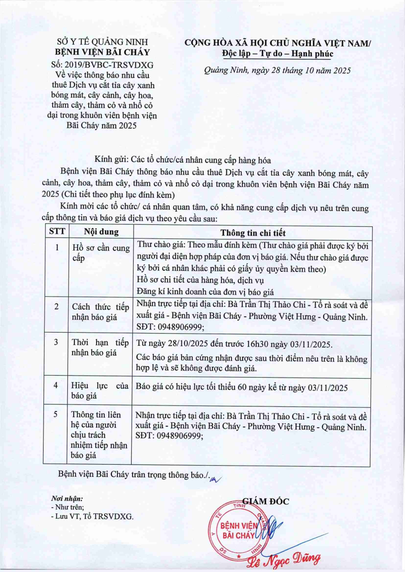 Thông báo 2019 nhu cầu thuê dịch vụ cắt tỉa cây xanh bóng mát, cây cảnh, cây hoa, thảm cây, thảm cỏ và nhổ cỏ dại