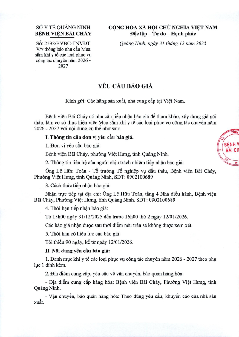 Thông báo 2592 về nhu cầu mua sắm khí y tế các loại phục vụ công tác chuyên môn 2026,2027 Hôm nay 08:57