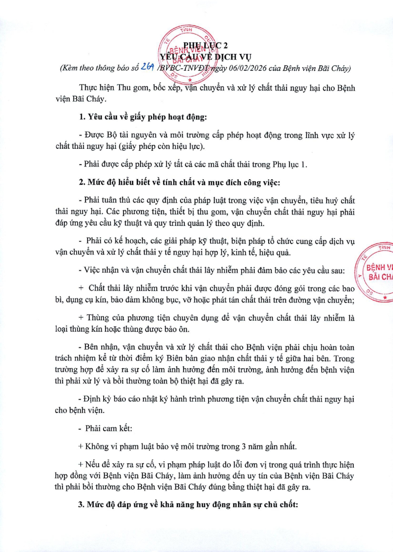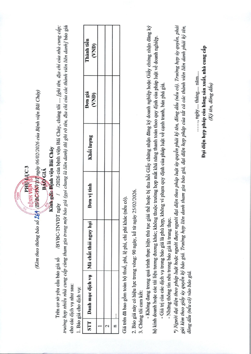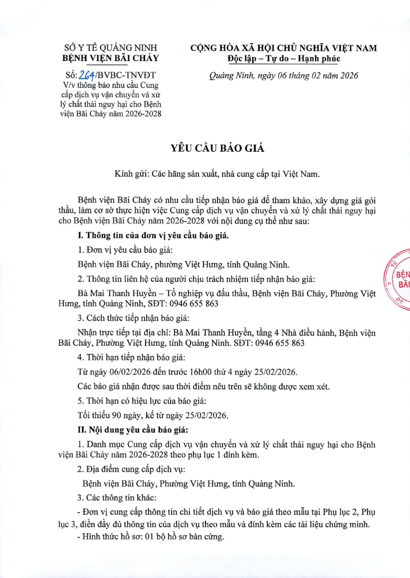 Thông báo 264 về cung cấp dịch vụ vận chuyển và xử lý chất thải nguy hại cho Bệnh viện Bãi Cháy 2026, 2028 Hôm nay 09:36