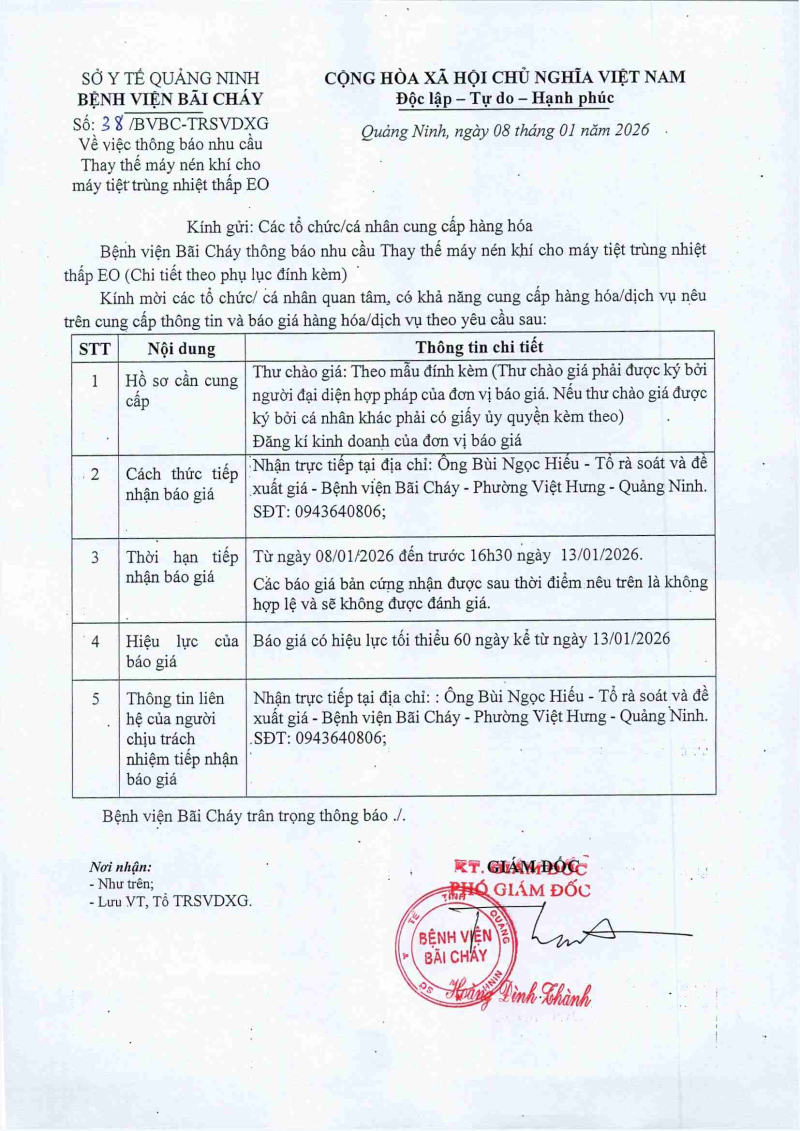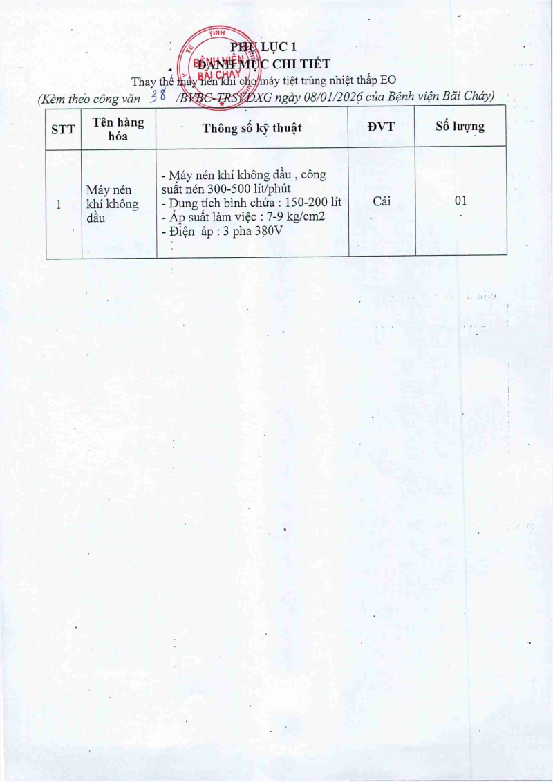 Thông báo 38 nhu cầu thay thế máy nén khí cho máy tiệt trùng nhiệt thấp EO 2026/01/08 03:59 Thông báo 38 nhu cầu thay thế máy nén khí cho máy tiệt trùng nhiệt thấp EO