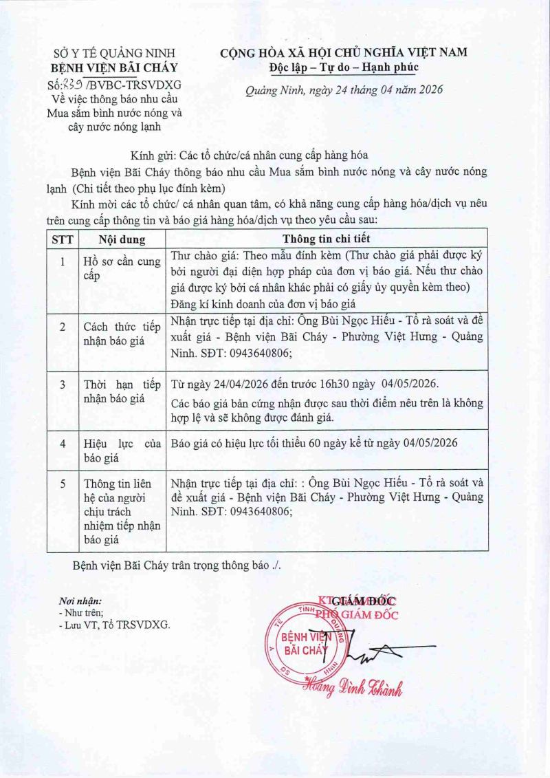 Thông báo 839 về nhu cầu mua sắm bình nước nóng và cây nước nóng lạnh