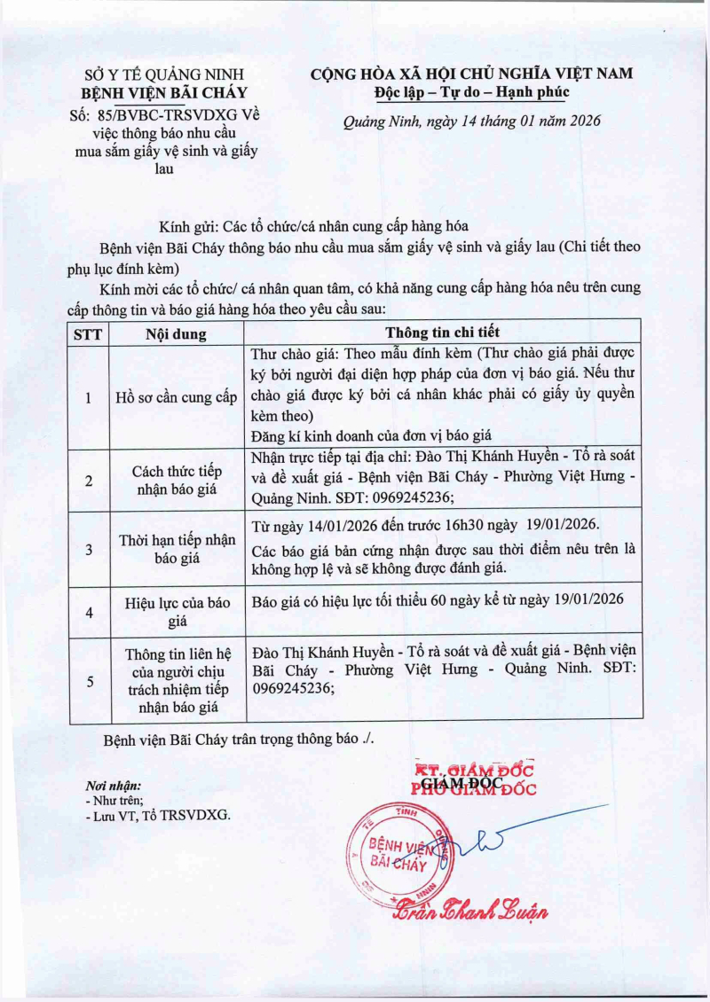Thông báo 85 về việc thông báo nhu cầu mua sắm giấy vệ sinh và giấy lau 2026/01/16 00:43 Thông báo 85 về việc thông báo nhu cầu mua sắm giấy vệ sinh và giấy lau