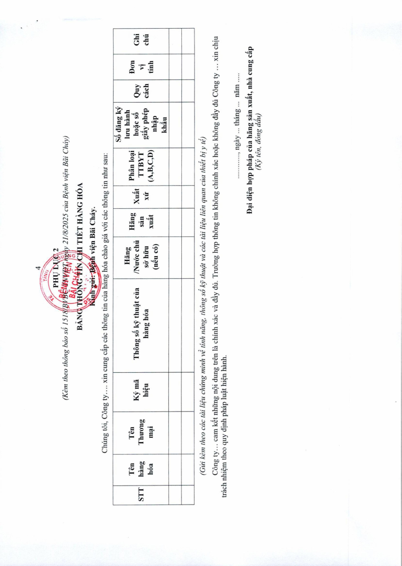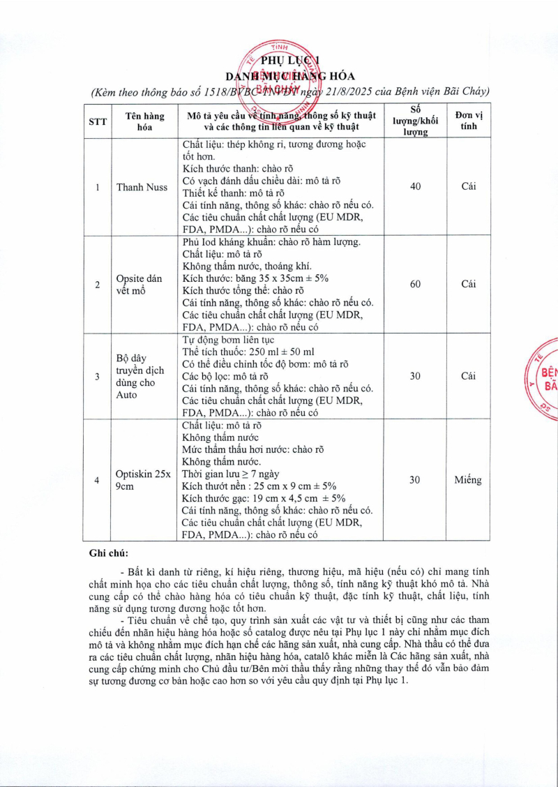 Thông báo số 1518 về nhu cầu mua sắm vật tư y tế phục vụ đề tài nghiên cứu ứng dụng kỹ thuật Nuss cải tiến điều trị lõm ngực bẩm sinh tại bệnh viện Bãi Cháy 2025/08/21 09:21