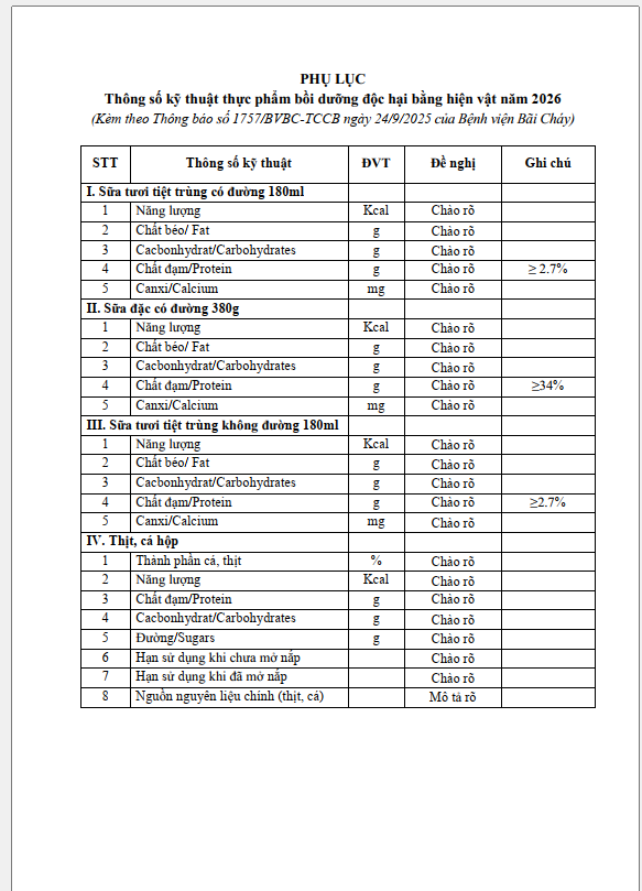Thông báo số 1757 về nhu cầu cung cấp thông số kỹ thuật một số thực phẩm bồi dưỡng bằng hiện vật năm 2026