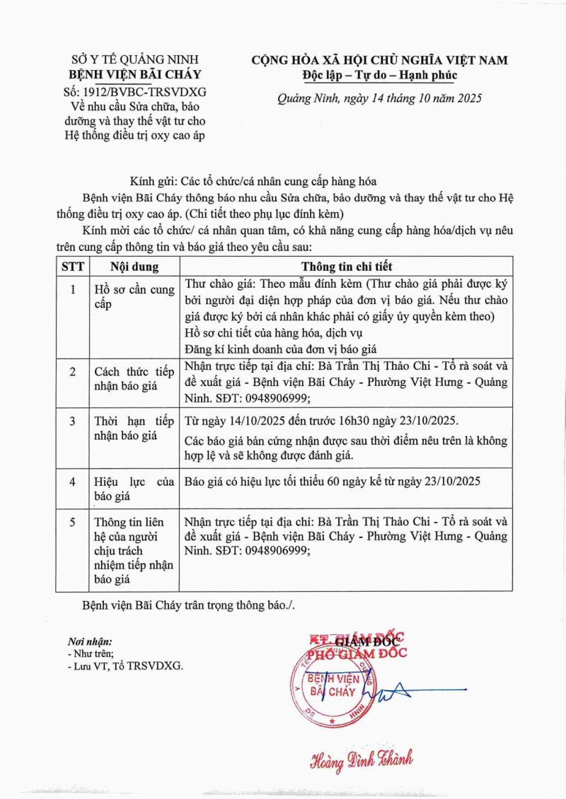 Thông báo số 1912 về nhu cầu sửa chữa, bảo dưỡng và thay thế hệ thống điều trị ô xy cao áp 2025/10/14 08:59