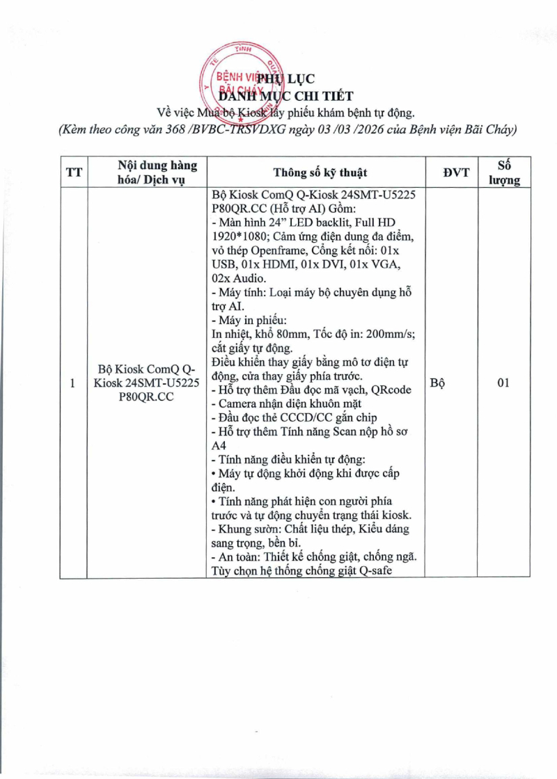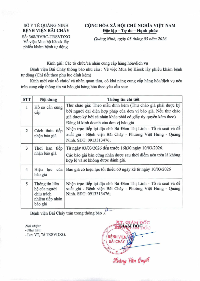 Thông báo số 368 về nhu cầu mua bộ kiosk lấy phiếu khám bệnh tự động