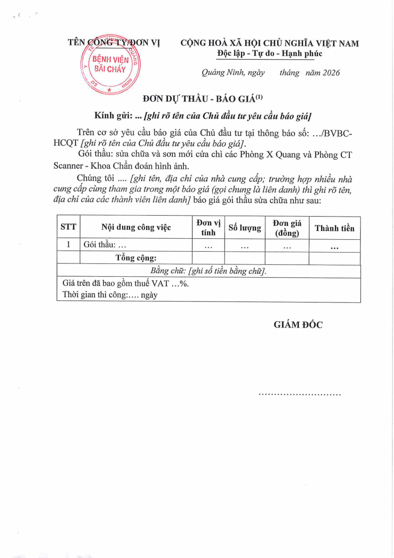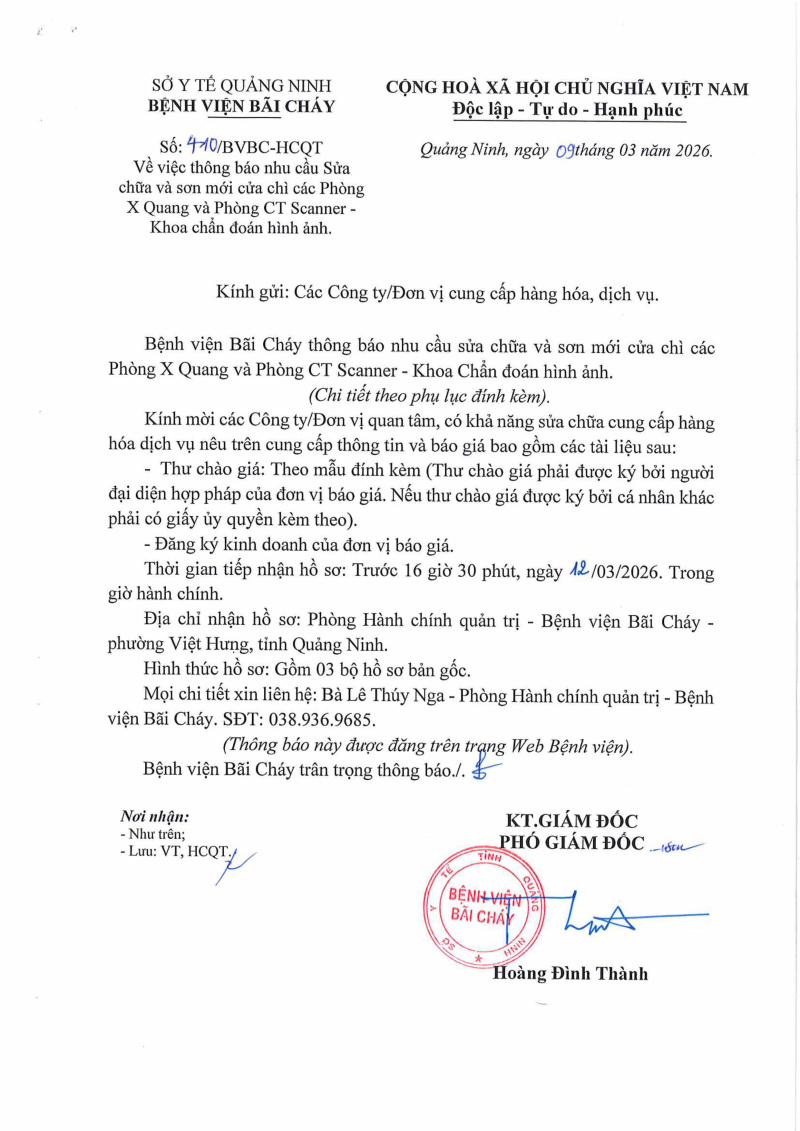 Thông báo số 410 về nhu cầu sửa chữa và sơn mới cửa chì các phòng X Quang và phòng CT Scanner khoa Chẩn đoán hình ảnh Hôm nay 07:21
