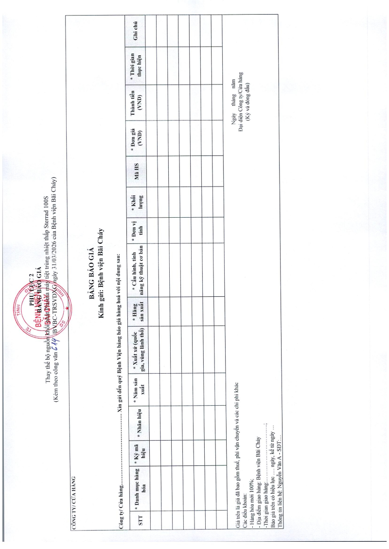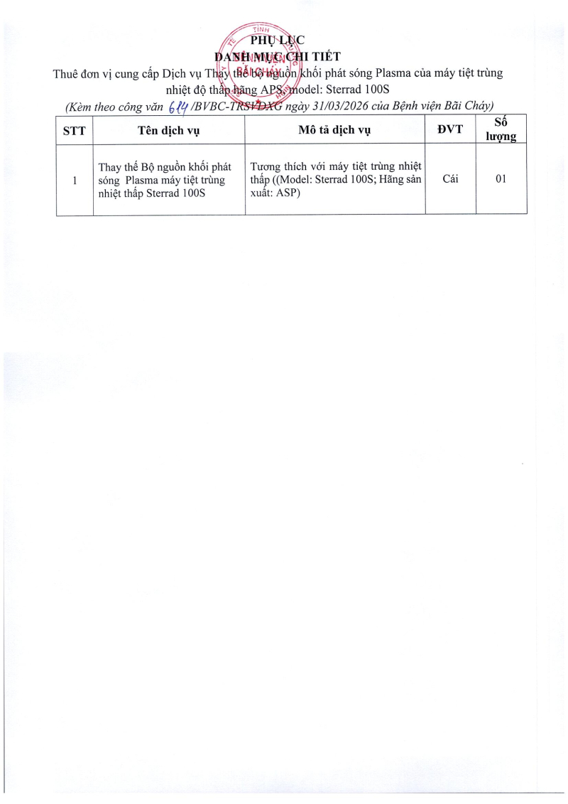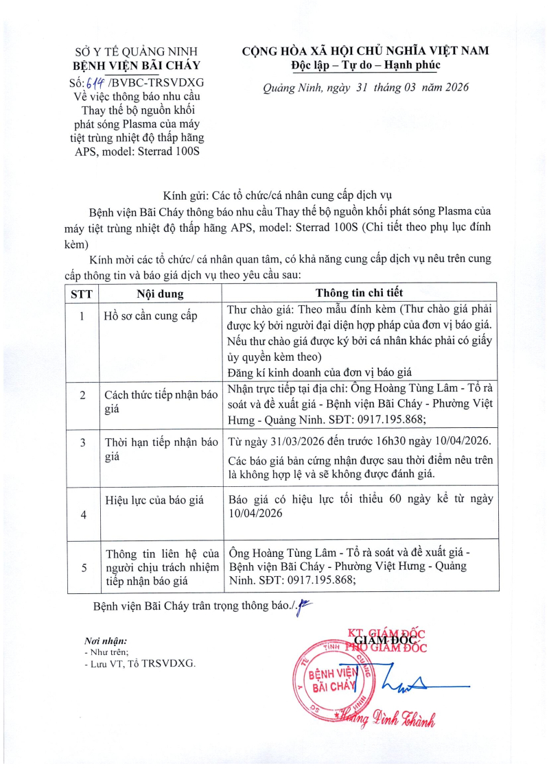 Thông báo số 614 về nhu cầu thay thế bộ nguồn khối phát sóng plasma của máy tiệt trùng nhiệt độ thấp hãng APS, model Sterrad 100S Hôm nay 08:08