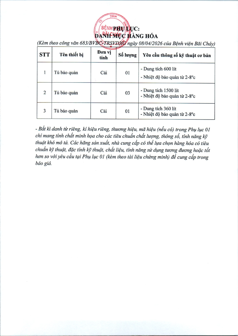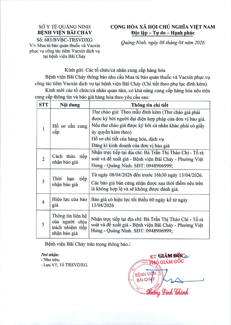 Thông báo số 683 về nhu cầu mua tủ bảo quản thuốc và vacxin phục vụ công tác tiêm vacxin dịch vụ tại bệnh viện Bãi Cháy