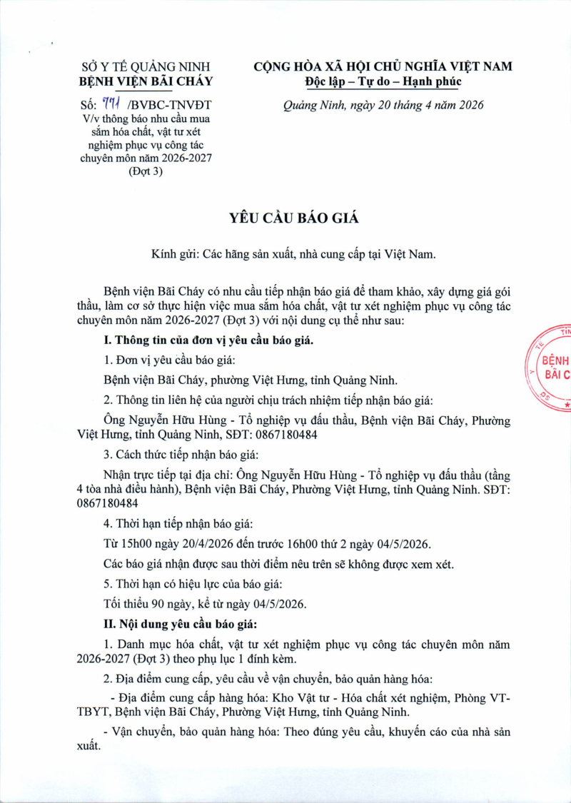 Thông báo số 771 về nhu cầu mua sắm hóa chất, vật tư xét nghiệm phục vụ công tác chuyên môn năm 2026 – 2027 (Đợt 3) 2026/04/20 07:02