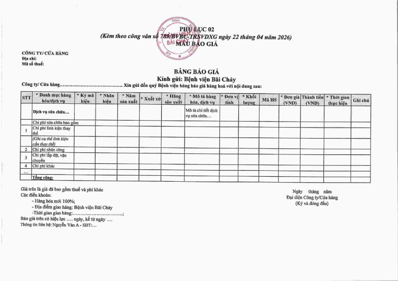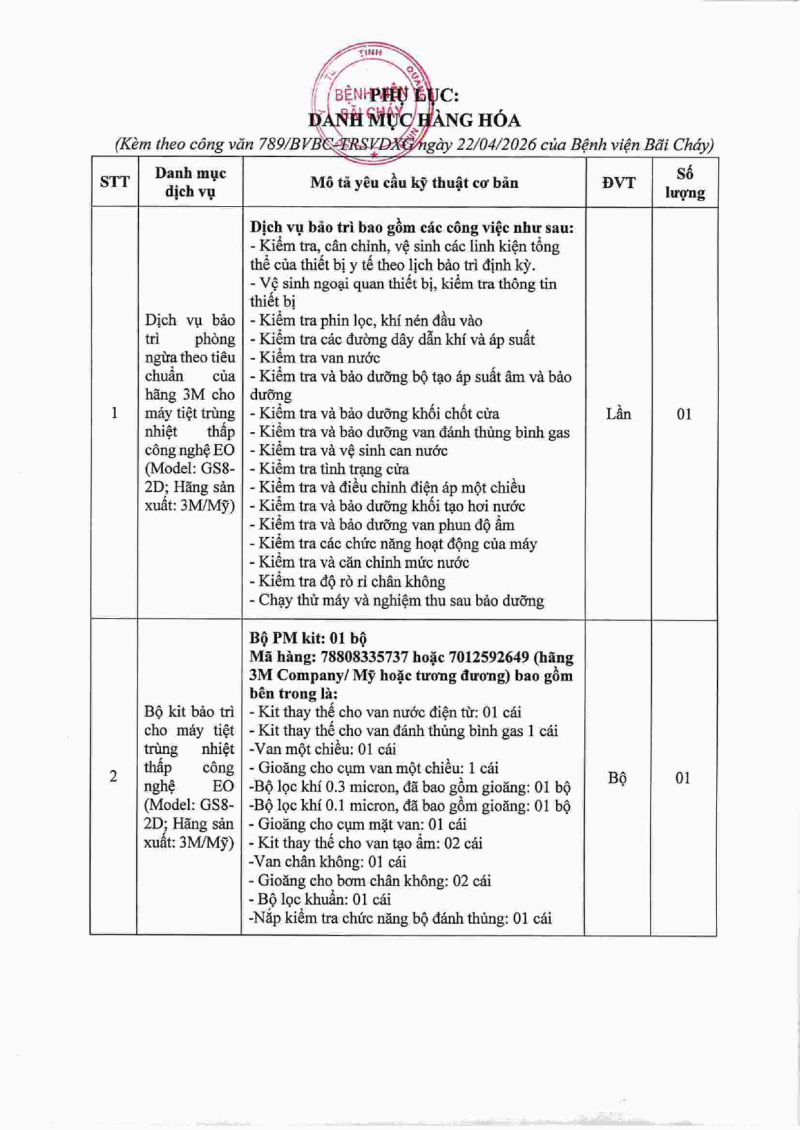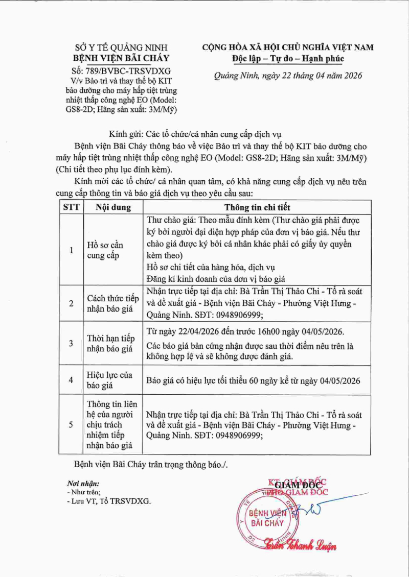 Thông báo số 789 về nhu cầu bảo trì và thay thế bộ KIT bảo dưỡng cho máy hấp tiệt trùng nhiệt thấp công nghệ EO (Model: GS8-2D; Hãng sản xuất: 3M/Mỹ) Hôm nay 09:47