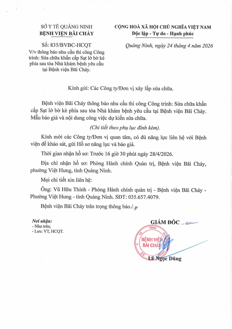 Thông báo số 835 về nhu cầu thi công công trình: Sửa chữa khẩn cấp sạt lở bờ kè phía sau tòa nhà khám bệnh yêu cầu tại Bệnh viện Bãi Cháy Hôm nay 13:55
